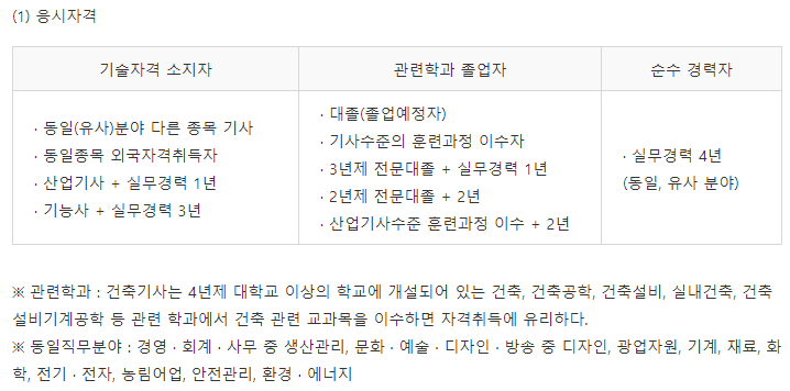 건축기사에 응시하기 위해선 위와 같은 자격을 충족해야합니다.