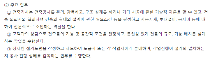 주로 하는 일은 건축공사를 관리 및 감독하며 구조 설계를 하는 것이다. 혹은 시공에 관한 기술적 자문을 하기도 하며, 건축을 의뢰인과 협의하여 건축에 대한 전반적인 필요조건을 따져서 전문적으로 조언하는 일을 합니다.