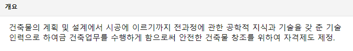 위 자격증은, 건축물의 계획에서부터 시공까지 이르는 모든 과정에 대한 공학적지식과 기술을 갖춘 인력을 선별하기 위해 제정되었습니다. 궁극적인 목표는 안전한 건축물을 창조하는 것입니다.