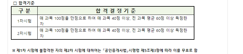 공인중개사 1차시험 및 2차시험의 합격 기준은 모든 과목이 각각 40점 이상을 취득하며, 각 과목의 평균이 60점 이상입니다.