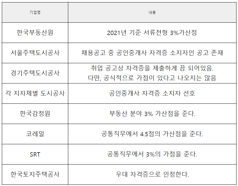 공인중개사 자격증을 취득했을 시 얻는 각종 채용 가점입니다.