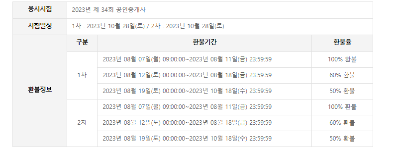 환불율은 시험 10일전까지는 약 50%까지 가능하며, 빈자리 원서접수기간 중 접수 후 취소 시에도 50% 환불이 가능합니다.