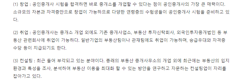 공인중개사를 취득하신다면 창업, 취업 및 컨설팅 모두 가능합니다.