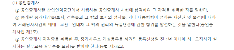 공인중개사란, 부동산 중개업을 올바르게 지도하고 육성하며, 올바른 거래 질서를 확립하기 위한 목적으로 제정된 자격증입니다. 'HRDK', 즉 산업인력공단에서 시행하는 시험이며, 중개대상물에 대해 거래자간의 매매, 교환 등의 권리의 득실변경에 관한 일련의 과정들을 집행하는 자격에 대한 시험입니다. 또한, 자격증을 취득한다고 바로 사무소를 등록하는 것이 아닙니다. 등록신청일 전 1년 이내에 시,도지사가 실시하는 연수를 받아야만 중개사무소를 등록할 수 있습니다.