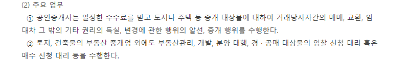 공인중개사가 하는 일은 가장 기본적으로 중개업무를 맡습니다. 그 외에도 컨설팅, 관리대행, 상가 분양 및 경매 매수신청 대리 등의 일을 맡습니다. 보다 구체적으로 말씀드리자면, 일정한 비용(수수료)을 받고 토지나 주택 등 중개 대상물에 대하여 거래자들간의 매매, 임대차 및 교환, 권리 득실 혹은 변경에 대한 중개를 맡습니다. 그만큼이나 똑똑해야겠죠?