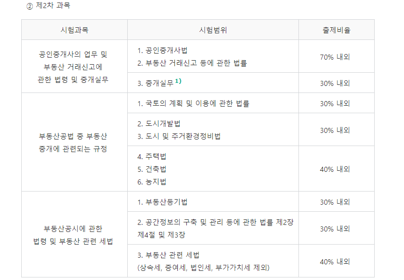 2차 시험은 2교시로 나뉘며 총 3과목을 치룹니다. 1교시에선 두 과목을 실시하며, 각 과목명은 '공인중개사의 업무 및 부동산 거래신고 등에 관한 법령 및 중개 실무'와 '부동산 공법 중 부동산 중개에 관련되는 규정'입니다. 마찬가지로 과목당 40문제를 풀어야하며, 1교시의 시험 시간은 100분입니다. 곧이어 실시되는 2교시는 한 과목만 출제되는데요, 40문제이며 시험시간은 50분입니다. 2차 시험도 모든 문제가 5지선택형으로 출제됩니다.