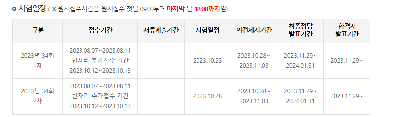 2023년 공인중개사 2차 시험 접수기간은 마찬가지로 8월 7일부터 8월 11일까지입니다. 빈자리 추가 접수기간도 마찬가지로 10월 12일부터 10월 13일이며, 2차 시험도 10월 28일에 실시합니다. 합격자 발표도 마찬가지로 11월 29일 입니다.