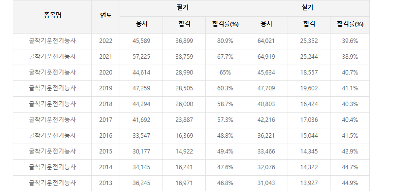 굴삭기운전기능사(굴착기운전기능사) 합격률입니다. 가장 최신 합격률인 2022년은 물론이며, 2021년과 2020년을 포함해 2013년까지, 10년 동안의 합격률 통계입니다.