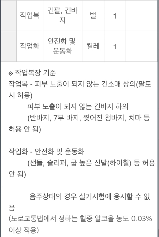 실기시험 복장은 작업복 및 작업화입니다.