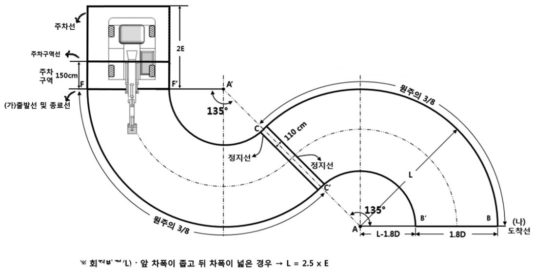 여러분들은 실기 시험에서 위와 같은 코스를 운행하게 됩니다. 굴삭기 및 굴착기가 지날 수 있는 폭 및 출발선, 정지선을 참고하시면 되겠습니다.