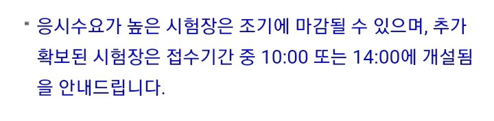 '응시수요가 높은 고사장은 조기 마감' 이후에 오는 문구를 주목해주세요. '추가 확보된 시험장 및 고사장은 접수기간 중 10시 혹은 14시에 개설됨을 안내드립니다.'