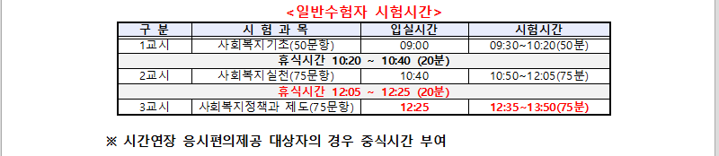 시험시간은 일반시험자, 응시편의 제공 대상자로 나뉩니다.