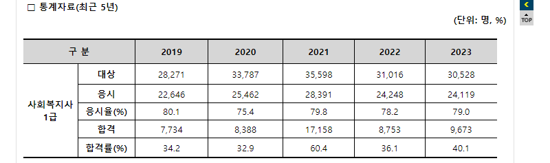 다음으론 사회복지사 1급 합격률입니다. 아무래도 2급에 비해선 높은 합격률을 보이네요.
