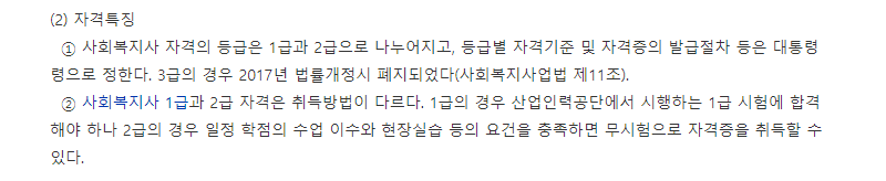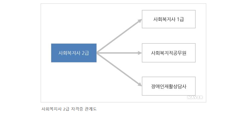 사회복지사 1급은 산업인력공단(HRDK)에서 시행하는 1급 시험에 합격해야하지만, 2급의 경우엔 어느정도 학점의 수업 이수 및 현장실습 등의 요건을 충족하면 시험 없이 자격증을 취득할 수 있다.