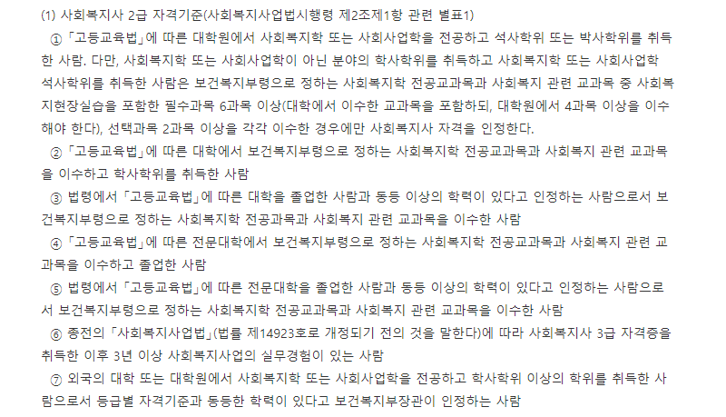 자격 조건은, 어떤 전공이든 전문학사(2년제 전문대) 이상 학위를 보유하는 것입니다. 2년제 이상 졸업자에 사회복지 교과목을 이수한다면 사회복지사 2급 자격증이 발급됩니다.