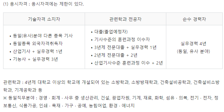 기사 시험이기 때문에, 기능사 및 산업기사보단 높은 자격을 갖추어야합니다.
