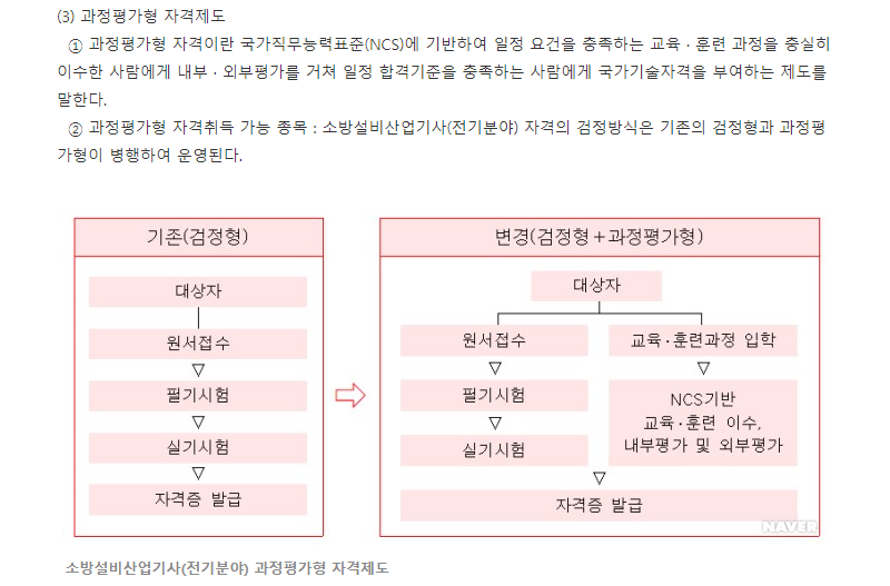 앞서 말씀드린 것 처럼 소방설비산업기사(전기) 및 기계 자격증은 2020년부터 과정평가형으로 취득할 수 있게됐습니다. 따라서 국가에서 지정한 훈련기관에 등록한 후 강의를 듣고 평가를 거쳤을 때 일정 수준 이상을 달성한다면, 별도의 검정형 시험없이 자격증을 취득할 수 있습니다. 모든 과정은 NCS에 기반해서 이루어지며 실무적인 능력 또한 향상할 수 있습니다.