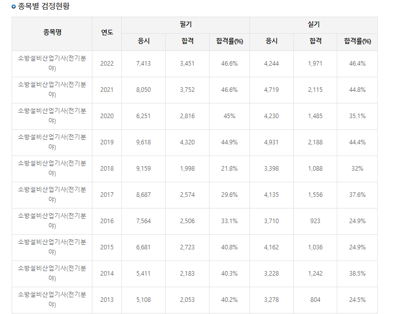 소방설비산업기사(전기분야) 및 소방전기산업기사의 합격률은 다음과 같습니다.