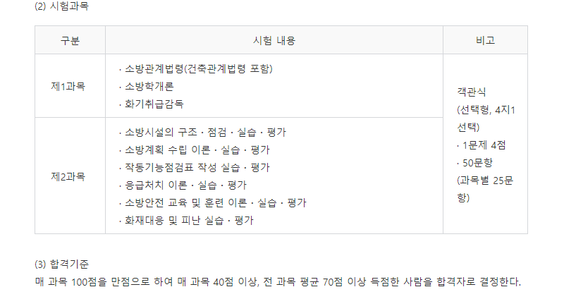 | 소방안전관리자 2급 | 소방관계법령(건축관계법령 포함) 소방학개론 화기취급감독 및 화재위험작업 허가·관리 (추가) 소방안전관리자 제도 (추가) 위험물, 전기, 가스 안전관리 (추가) 피난시설, 방화구획 및 방화시설의 관리 (추가) 소방시설의 종류 및 기준 (추가) 소방시설(소화설비, 경보설비, 피난구조설비)의 구조 |