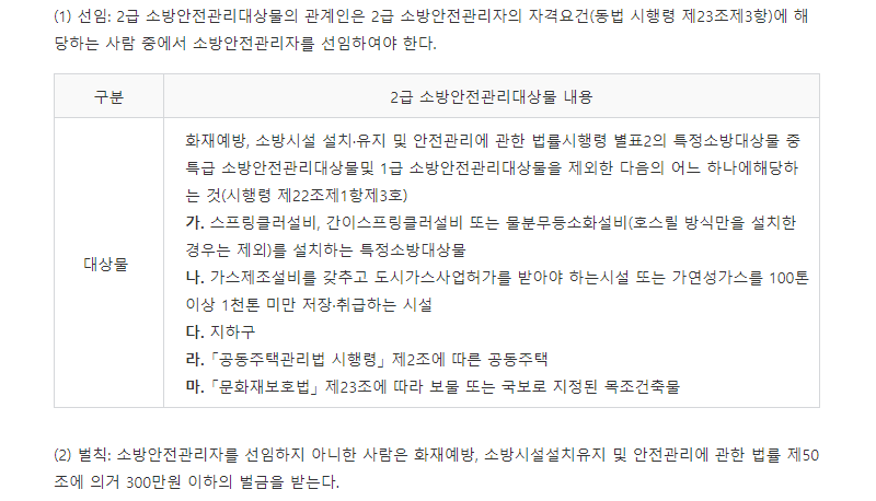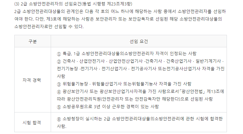 2급 소방안전관리대상물(건물)의 관계인은 아래 자격을 갖춘 사람에 대해서 소방안전관리자를 선임해야하만합니다. 이는 법적인 의무사항입니다.