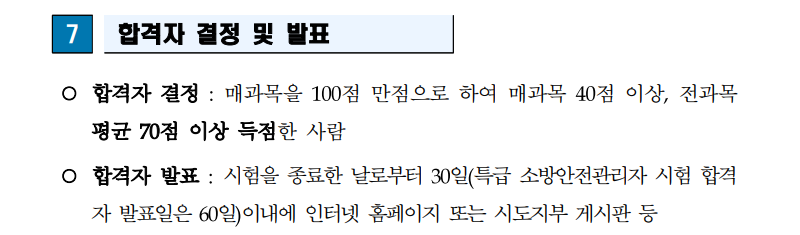 합격 기준은 각 과목이 40점 이상이며 전 과목 평균이 70점 이상이면 됩니다.