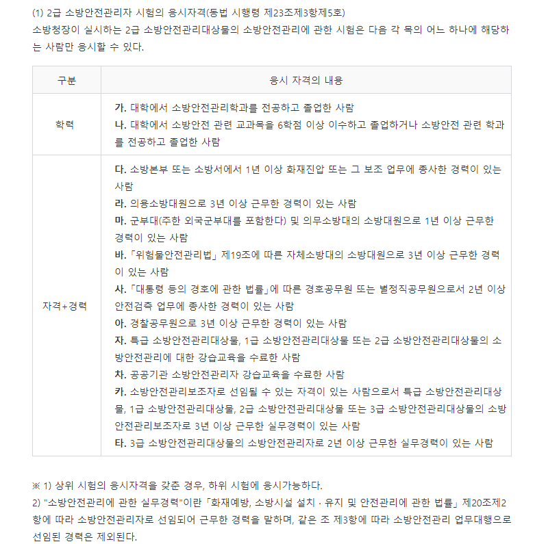 소방안전관리자 2급 시험은 소방청장이 실시하며, 주로 2급 소방안전관리대상물에 대한 책임 및 권한을 갖습니다. 시험에 대한 응시자격은 아래 내용과 같습니다.