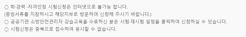 만일 소방공무원으로써 3년간 경력이 인정되면 별도의 시험 없이 소방안전관리자 2급 선임자격이 생깁니다. 또한, 소방에 관련된 학과 졸업생은 강습을 받지 않고 시험에 응시할 수 있다는 특징이 있습니다.