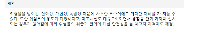 인화성, 가연성은 물론이며 폭발성까지 가지고있으므로 작은 부주의에도 대규모 재해를 불러올 수 있습니다. 또한 위험물의 종류와 용도가 날을 거듭할수록 다양해지고, 이를 제조하는 시설 또한 규모가 커짐에 따라 위험물의 취급과 관리에 대한 안정성을 높이고자 만든 자격증입니다.