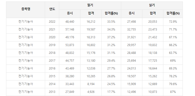 지난 2013년부터 10년간 전기기능사 합격률 통계입니다.
