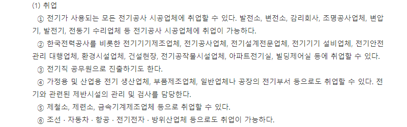 그 외에도 전기 생산업체, 민간 발전 시설, 관련 기구 부품 제조업체에서 시설 관리 및 검사 업무 등을 담당할 수 있습니다.
