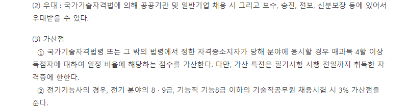 전기기능사는 전기 분야의 기능직 기능 8급 이하의 공무원 채용시험 시 3%의 가점을 받을 수 있습니다.