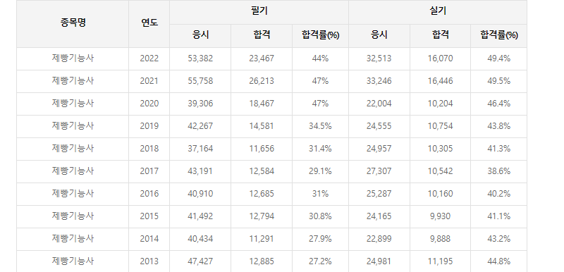 전반적인 합격률로 미루어봤을 때 평이한 수준의 시험으로 보입니다. 하지만, 실기시험은 작업형이자, 실제로 빵을 만들어야하므로 실무자가 아니라면 학원을 따로 다니거나 책이나 영상 등으로 학습해야합니다.