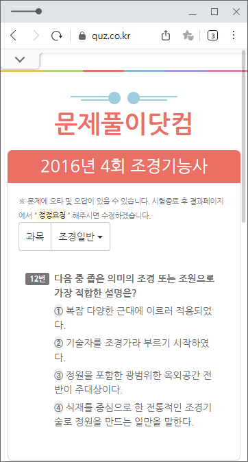 마찬가지로 해당 사이트를 통해 조경기능사 필기 시험 문제를 풀 수 있습니다.