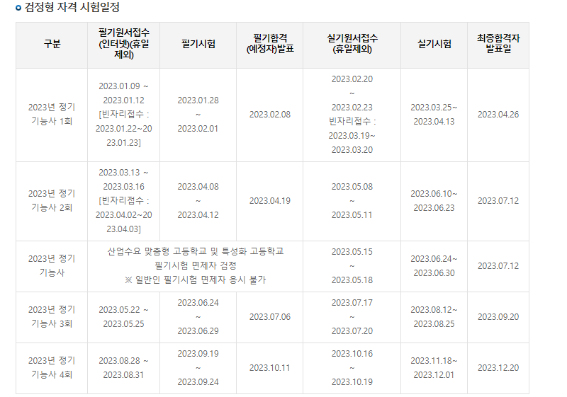 1회 시험 필기 접수기간, 필기 시험 날짜, 필기합격자 발표 (합격 예정자), 실기 시험 원서 접수, 실기 시험, 최종합격자 발표일 순으로 이루어져있습니다. 2회 뿐만 아니라 3회 및 4회에 대한 시험 일정이 나와있으므로 2023년 시험 일정에 참고하시어 불이익이 없게끔 준비해주세요.