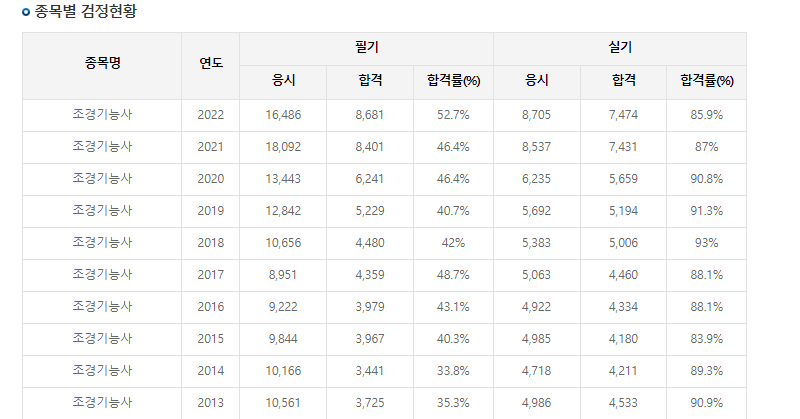 2020년도 조경기능사 실기 합격률은 90.8%로 상당히 높게 나타났습니다. 바로 다음 년도인 2021년엔 87%를 기록했으나, 여전히 높은 합격률로 나타났습니다. 그리고 작년인 2022년에는 85.9%의 합격률을 보이며, 이변은 없다는 것을 증명하고있네요.