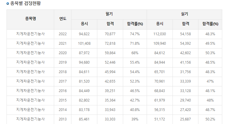 지게차운전기능사의 필기 시험 합격률입니다.