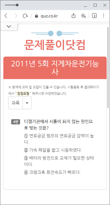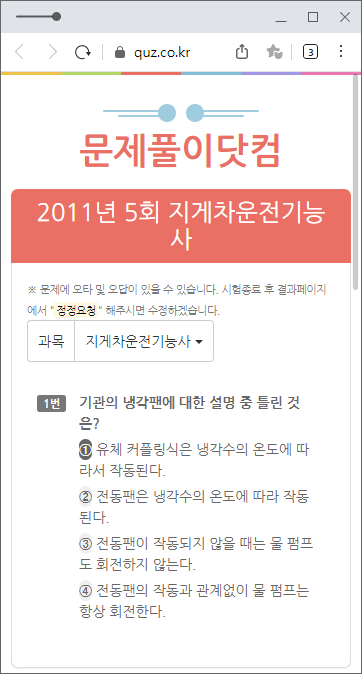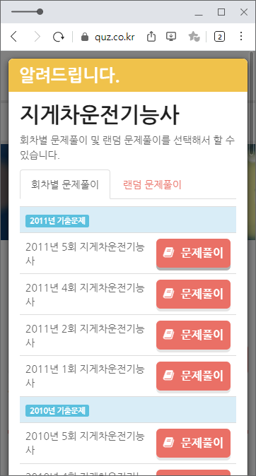 다음으로 소개할 사이트는 '문제풀이닷컴'입니다. 마찬가지로 지게차운전기능사를 포함한 여러 자격증에 대한 필기시험 및 실기시험이 잘 복원된 곳입니다. 마찬가지로 모바일로도 언제 어디서든 필기 시험 대비가 가능하므로, 책을 따로 사지 않으신다면 해당 사이트를 추천드립니다.