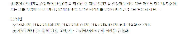 지게차운전기능사를 취득할 시 주로 창업 혹은 취업이라는 길로에 서게됩니다.