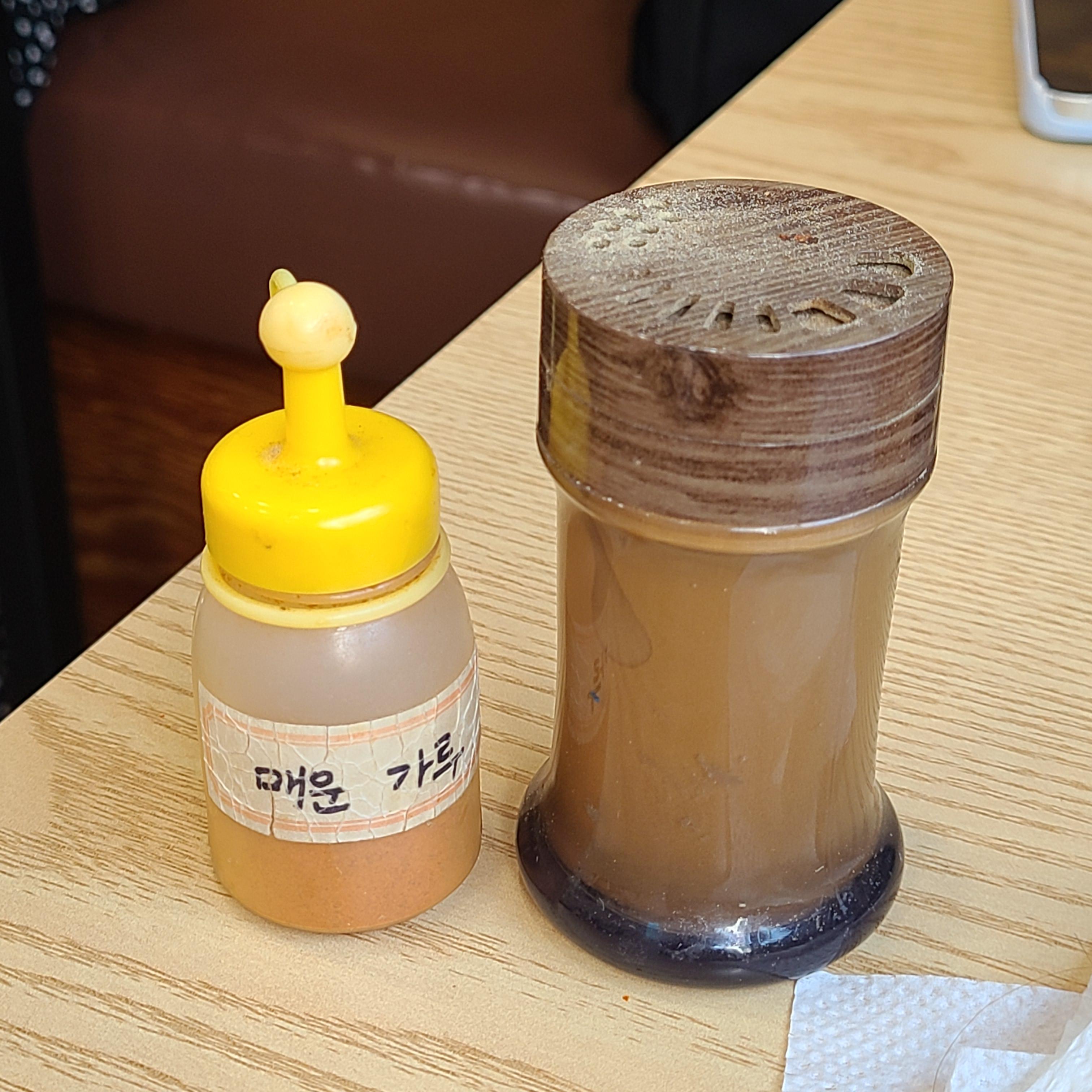 저기 보이시는 매운 가루는 맵기를 조절할 수 있는 가루인데요, 굉장히 매우므로 적당히 첨가해가며 드시는 것을 추천드립니다.