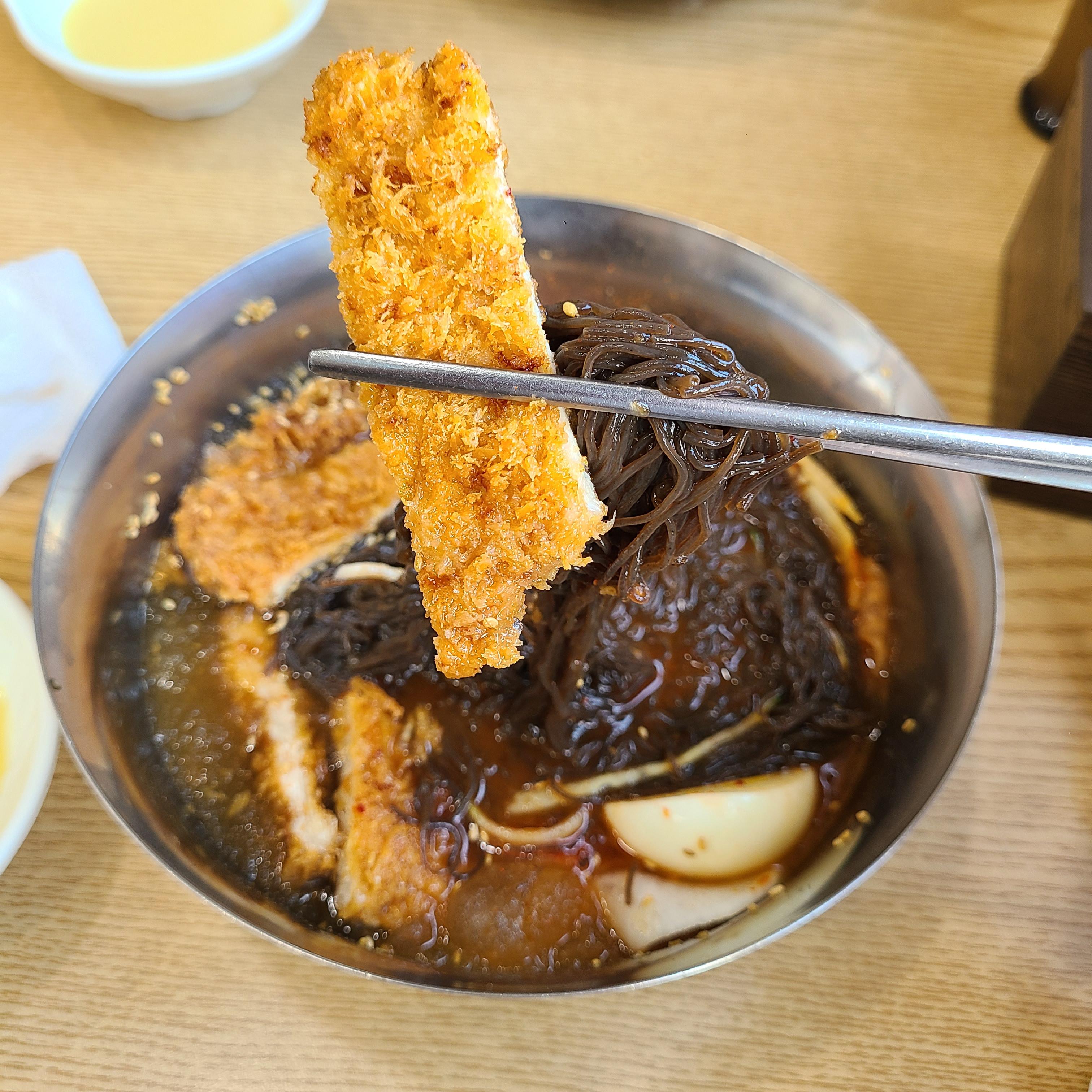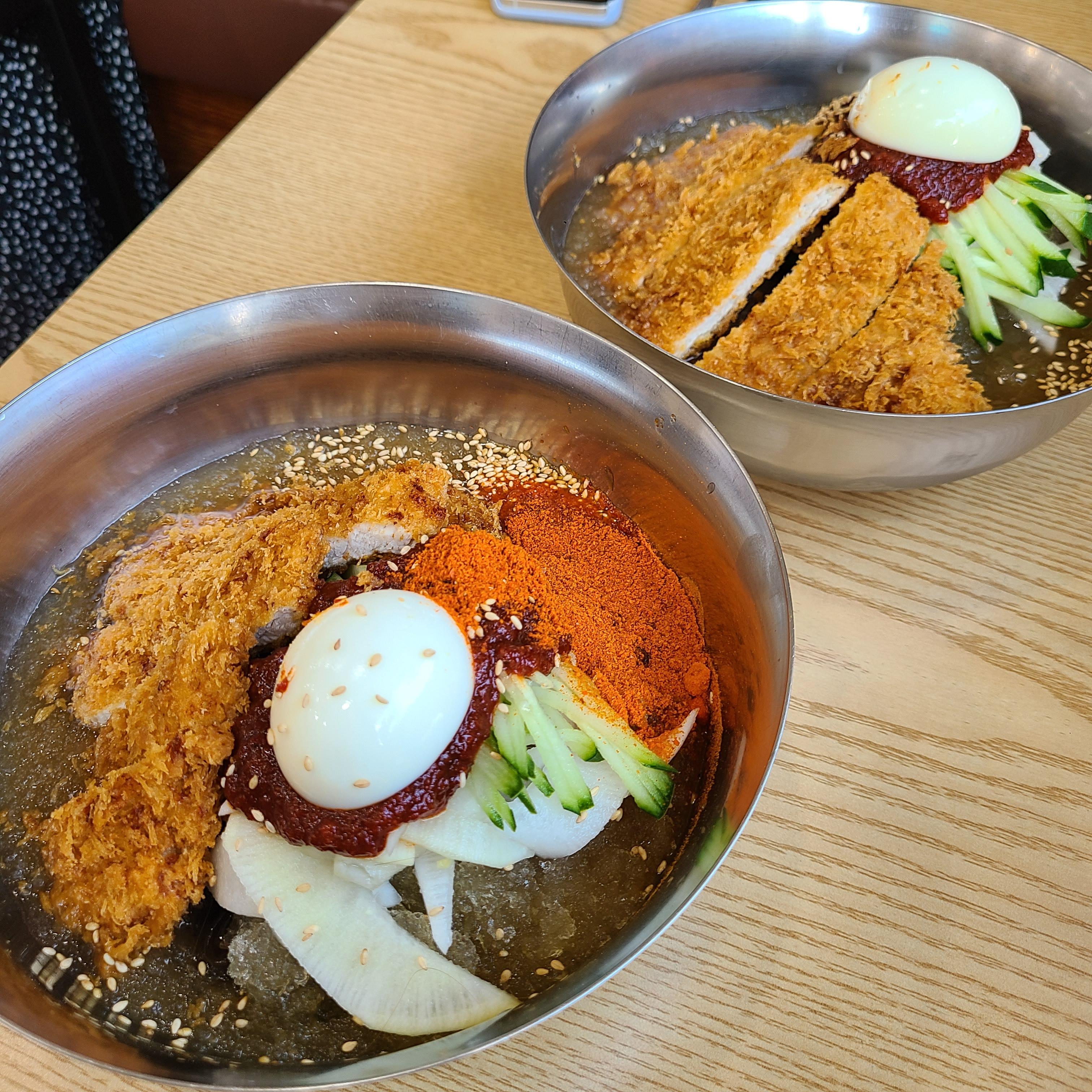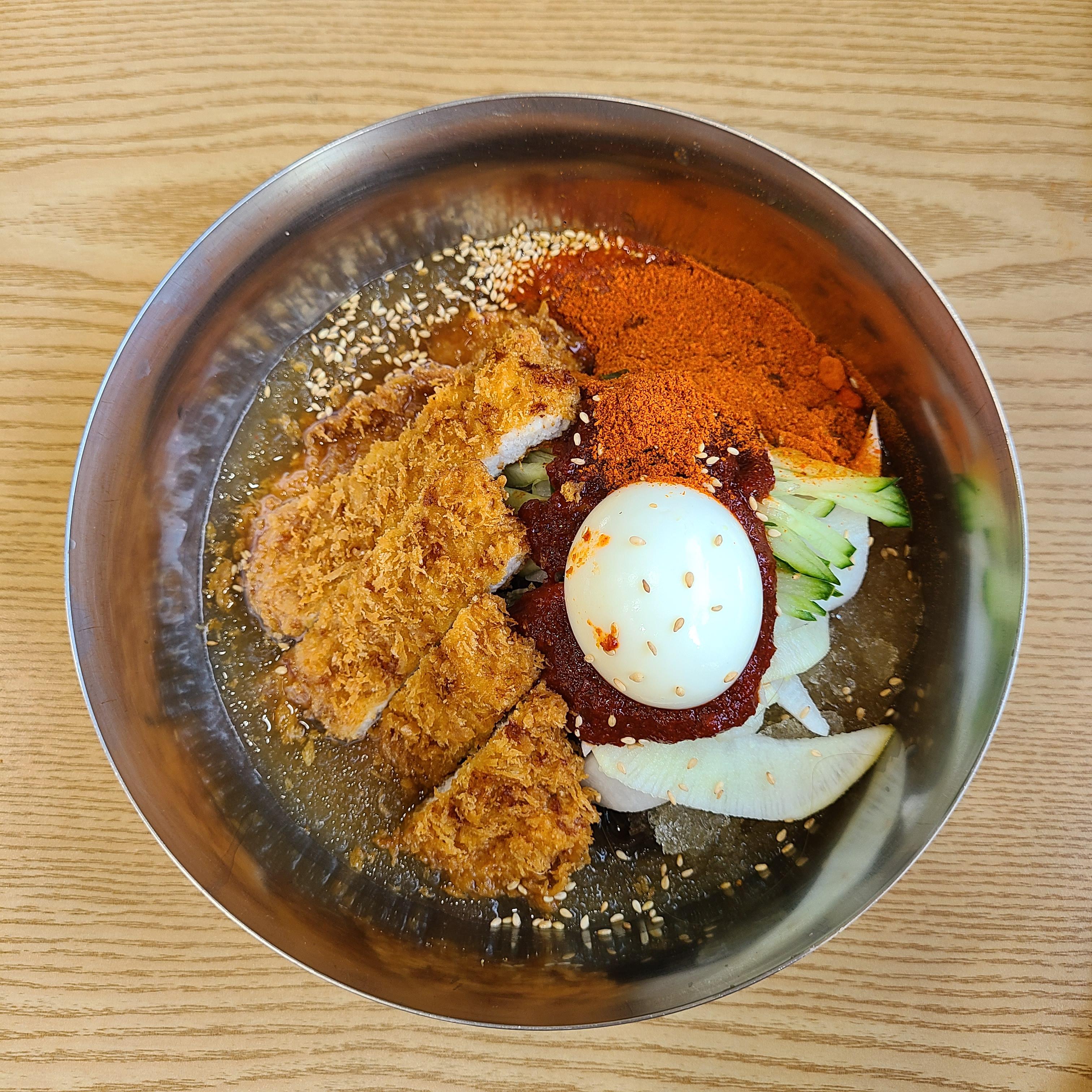 저는 개인적으로 냉면 육수에 적당히 절여진 촉촉한 돈까스가 인상적이었어요.