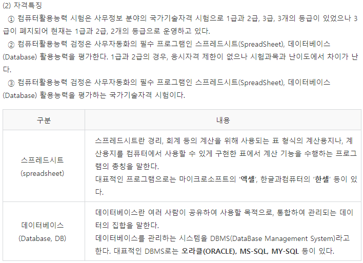 1급에서는 주로 스프레드시트와 데이터베이스(DB)를 다룹니다.