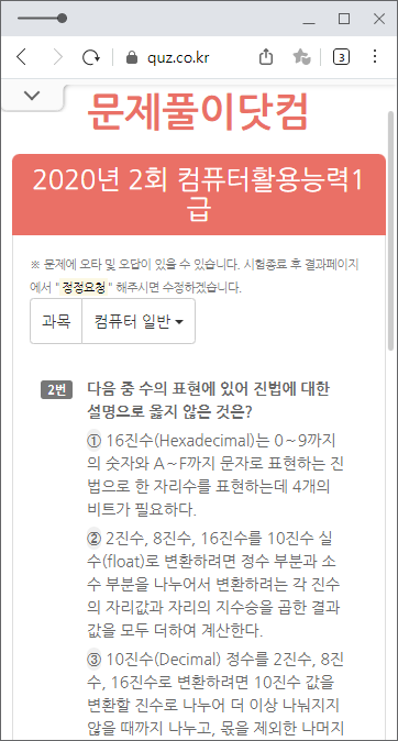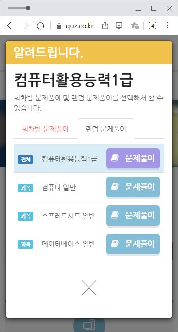 해당 사이트에서 컴퓨터활용능력 필기문제를 풀 수 있습니다.