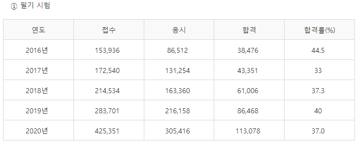 필기시험은 약 40% 내외의 적당한 합격률을 보였습니다.