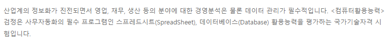 영업, 생산, 재무 등 다양한 분야에서 분석을 수월하게 만드는 사무자동화 필수 프로그램인 스프레드시트, 데이터베이스에 대한 이해도와 사용 능력을 평가하는 국가기술자격 시험입니다.