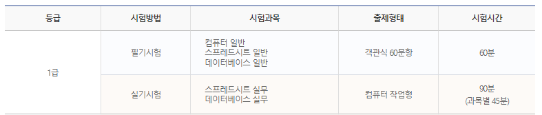 1급에서는 주로 스프레드시트와 데이터베이스(DB)를 다룹니다.