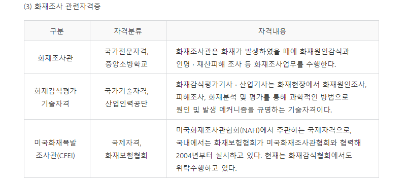 - 화재조사관 : 중앙소방학교 주관하에 취득할 수 있는 국가전문자격으로, 화재발생 시 화재원인 감식 및 피해조사에 관련된 조사업무 수행에 관련된 자격증입니다.