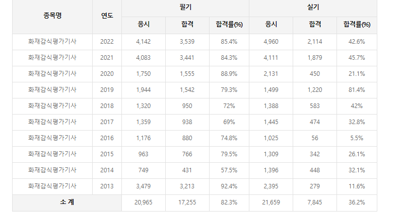화재감식평가기사의 필기시험 및 실기시험 합격률입니다.