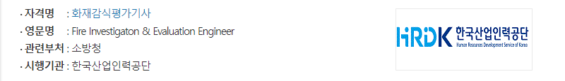 - 화재감식평가 기술자격 : 산업인력공단 주관하에 취득할 수 있는 국가기술자격으로, 지금 다루고 있는 자격증을 말합니다.