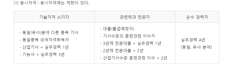 기술자격 소지자의 경우, 관련학과 전공자의 경우, 순수 경력자의 경우로 크게 3개의 범주로 두기 때문에, 본인이 속하는 범주 내에서 시험 응시가 가능한지 살펴보세요. 참고로 어떠한 기사자격증이라도 보유한다면 응시할 수 있습니다.