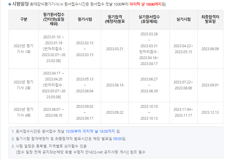 화재감식평가기사 자격증은 1년에 3번 시행합니다. 소방설비기사 자격증과 마찬가지인 1,2,4회차 시험에서 응시가 가능합니다. 필기원서접수, 필기시험, 합격자 발표, 실기원서접수, 실기시험 및 최종합격자 날짜까지 꼼꼼하게 체크하시고 불이익을 받지 않으시길 바랍니다.
